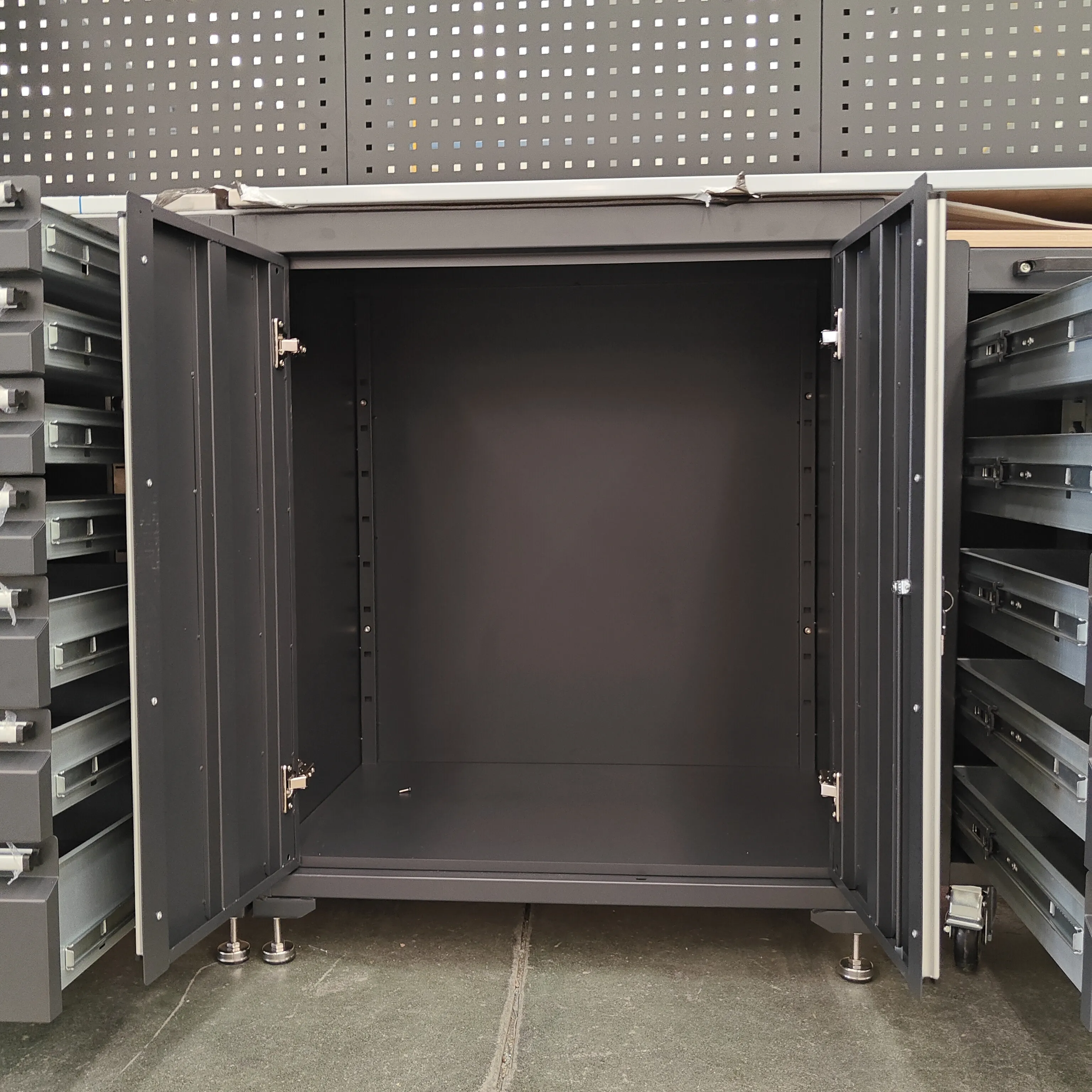 ຕູ້ເຄື່ອງມືທີ່ມີຫນ້າທີ່ຫນັກມີລັກສະນະຫຼາຍລິ້ນຊັກ, ໂດຍມີການອອກແບບຊັ້ນວາງທີ່ເປີດສໍາລັບແຕ່ລະລິ້ນຊັກ, ເຫມາະສໍາລັບເຄື່ອງມືທີ່ມີຂະຫນາດແຕກຕ່າງກັນ.