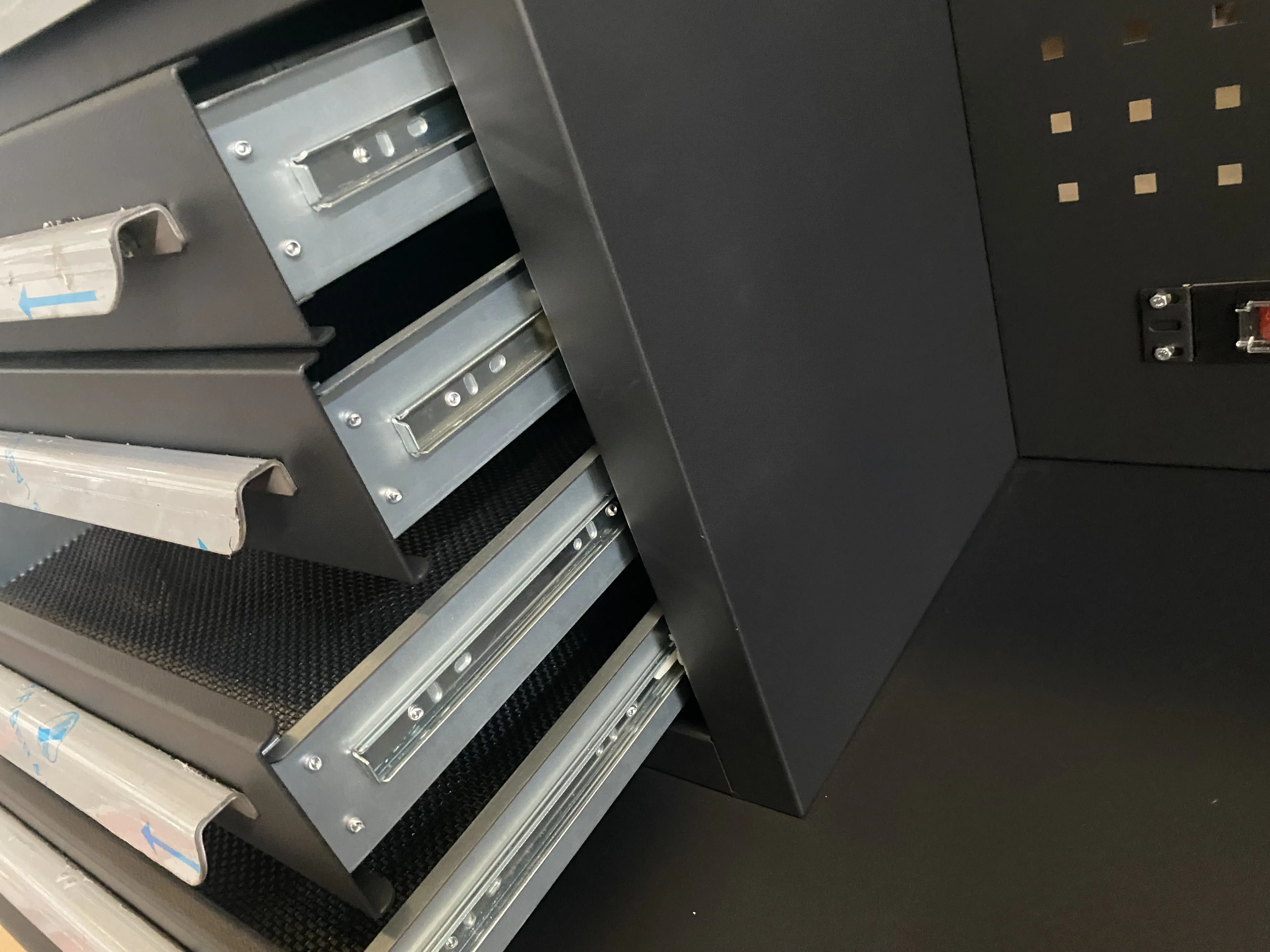 ຕູ້ເຄື່ອງມືແມ່ນຍາວຂະຫນາດ 2550 ມິນລີແມັດ. ຄວາມຫນາ, ສີ, ຂະຫນາດແລະລິ້ນຊັກສາມາດປັບແຕ່ງຕາມຄວາມຕ້ອງການຂອງລູກຄ້າ. ທັງ wrokbench ແລະລິ້ນຊັກແມ່ນເຮັດດ້ວຍເຫຼັກເຢັນ. ມັນມີສອງແຖບພະລັງງານທີ່ນີ້. The drawers are equipped with LED lights, The LED lights can be hung on the mesh panel that facilitate lighting when working on the workbench. ມີເບາະໃນລິ້ນຊັກ, ເຊິ່ງສາມາດຫຼຸດຜ່ອນຮອຍຂີດຂ່ວນ.